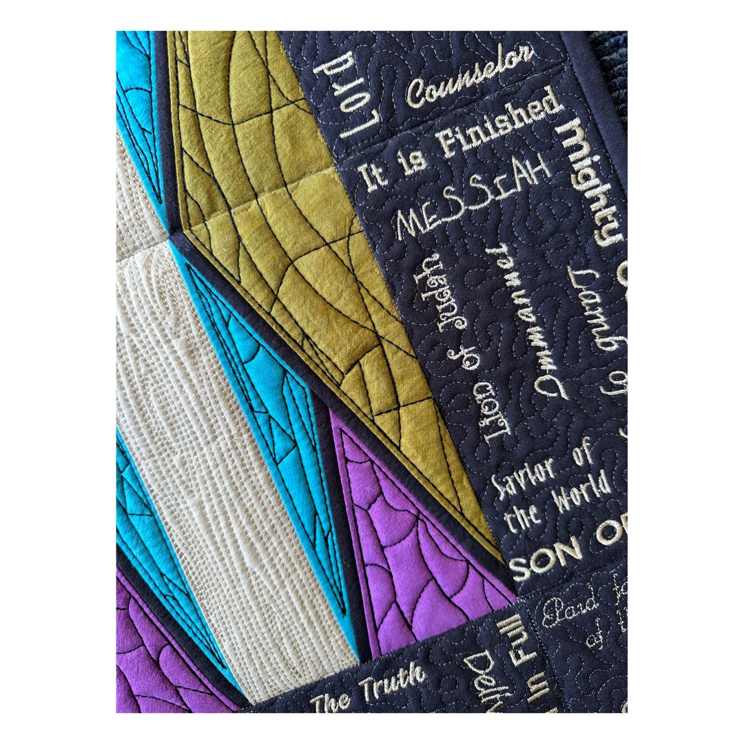 At The Cross is the perfect Easter project. The inside of the quilt showcases the 'old rugged cross' with the blood stained crown of thorns set in front of stained-glass windows. The border features the names of God; it will keep us in remembrance of who He is and what He has done for us.