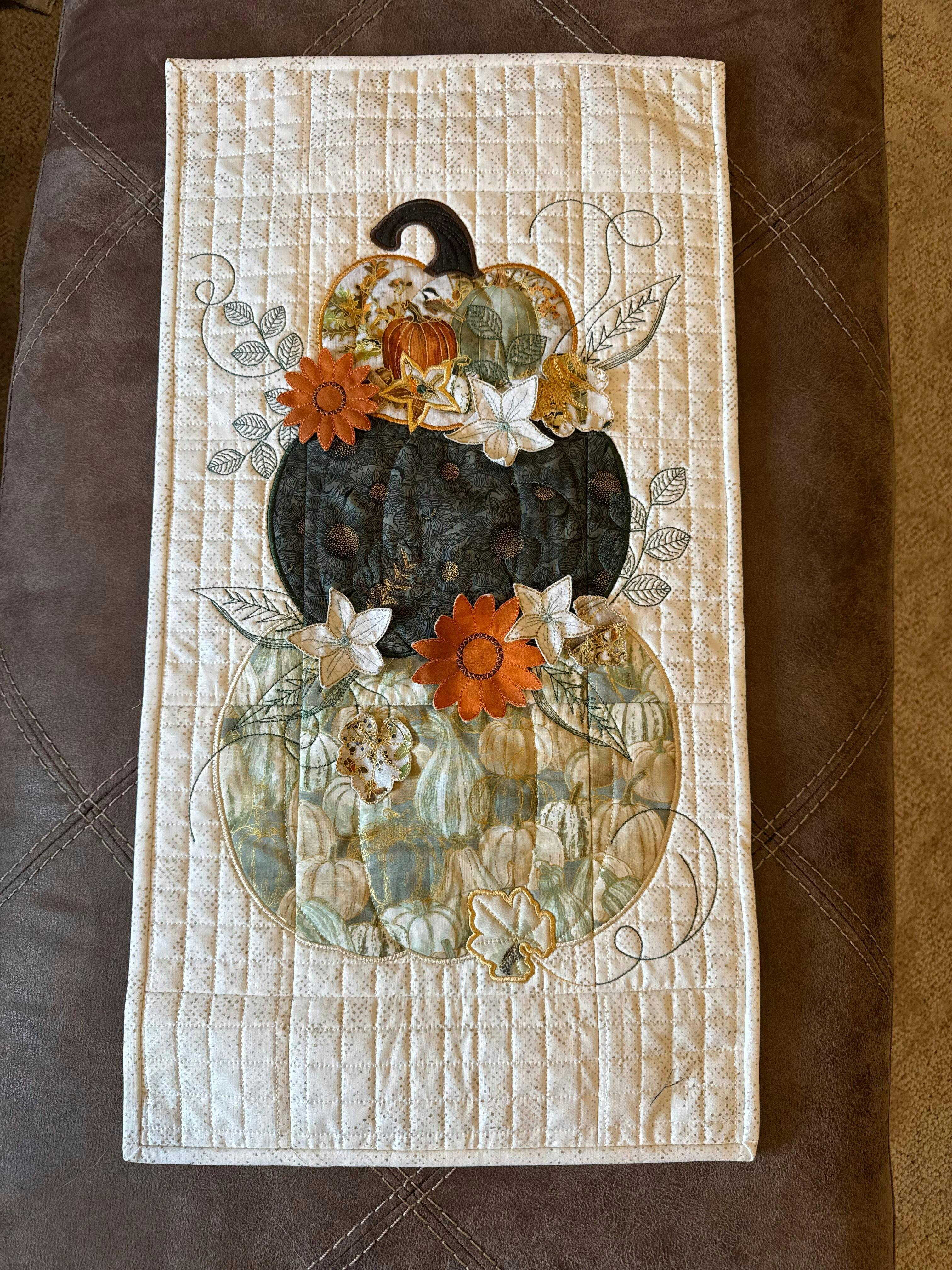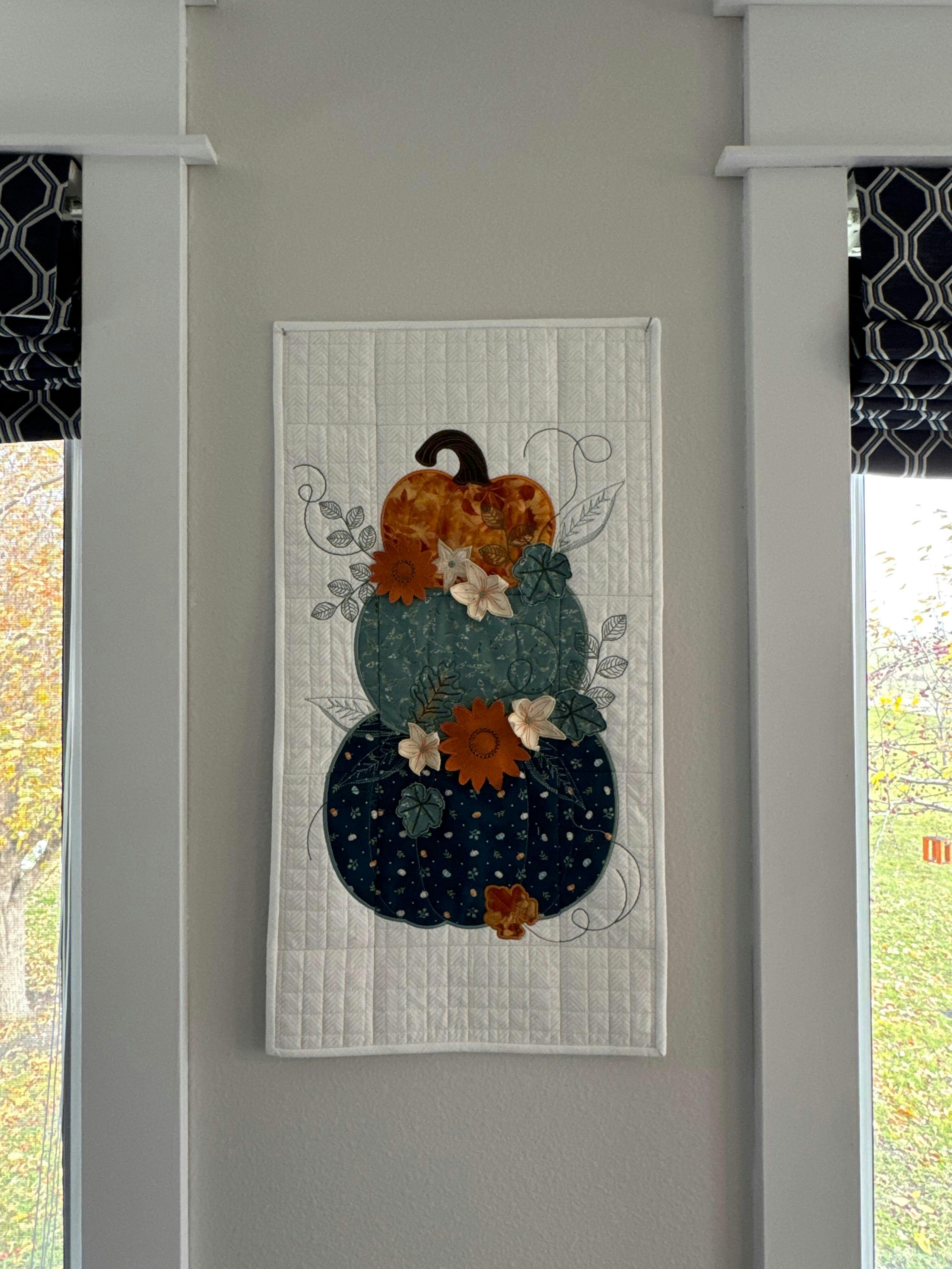 Autumn Garden is a pile of pumpkins that are so cute, you might just want to stitch them twice! Three pumpkins stacked on top of each other decorated with stunning 3D flowers. From sunflowers to pumpkin flowers and leaves, this three-block wall hanging is the perfect fall décor for your home!