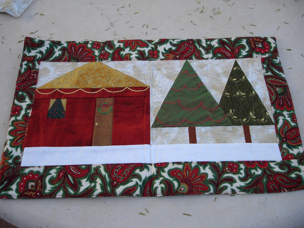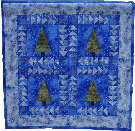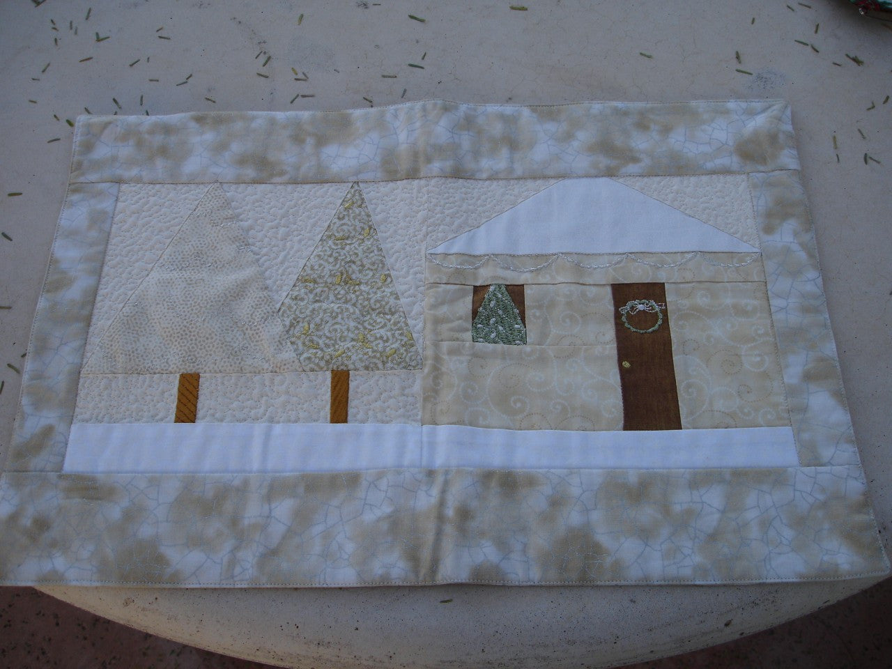 Dress up your home for the Holidays! Wall hanging and placemat project plus 12 gorgeous Christmas Tree embroidery designs. Christmas Trees decorated with garland and ornaments, snow falling in the background. Flying geese border all around it! Great little wall hanging to get ready for the holiday season. Placemat project with house and tree decorated for Christmas. Complete instructions included.