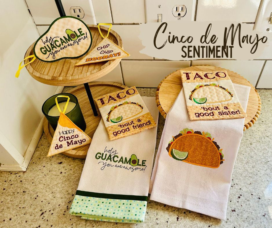 Embroidery & Applique: These festive designs are perfect for anyone who loves Cinco de Mayo! The taco applique is perfect for an apron. Stitch the Holy Guacamole embroidery on a tea towel to make a wonderful gift for a friend. File Sizes: 4.79” x 2.18” and 4.90” x 3.03”