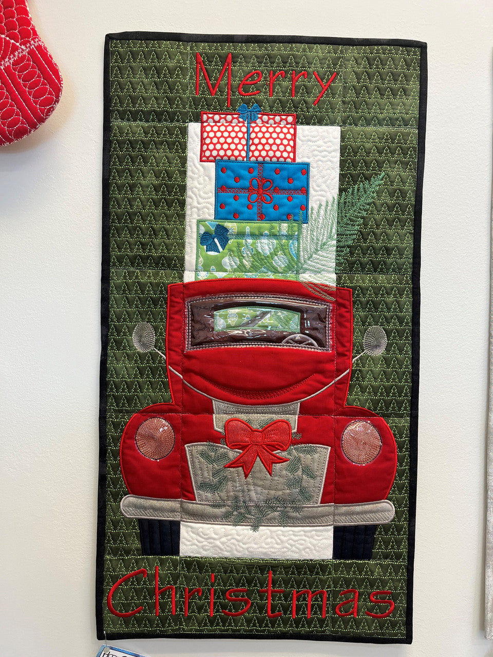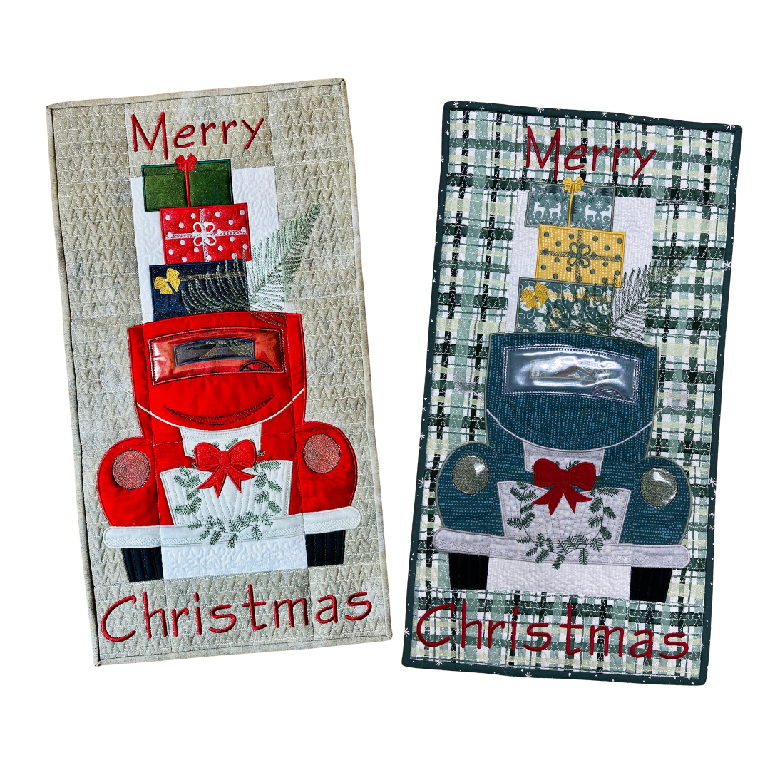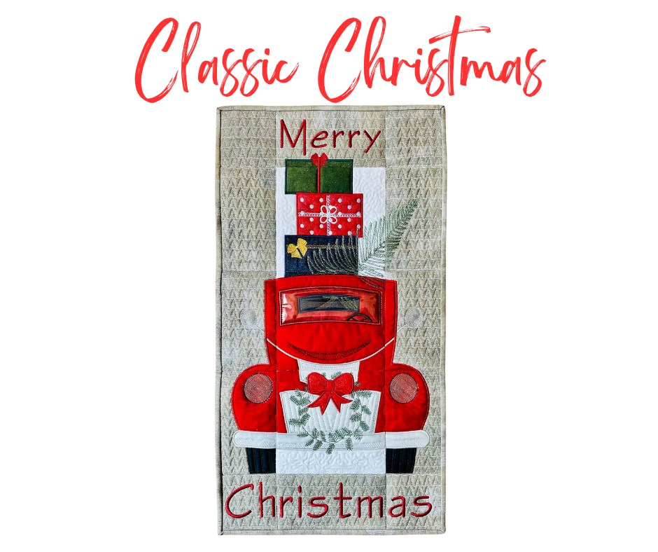Our "Classic Christmas" Wall Hanging features a vintage truck piled with gifts, a tree in the back which can be seen through the back window of the truck. A pine wreath adorns the front of our classic red truck!