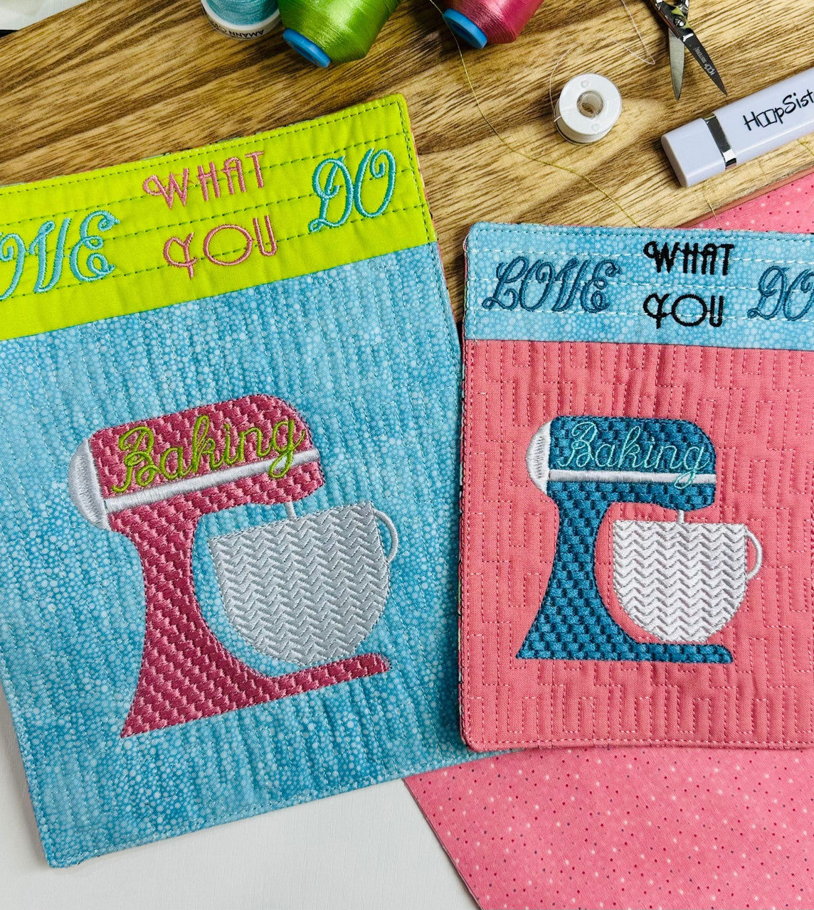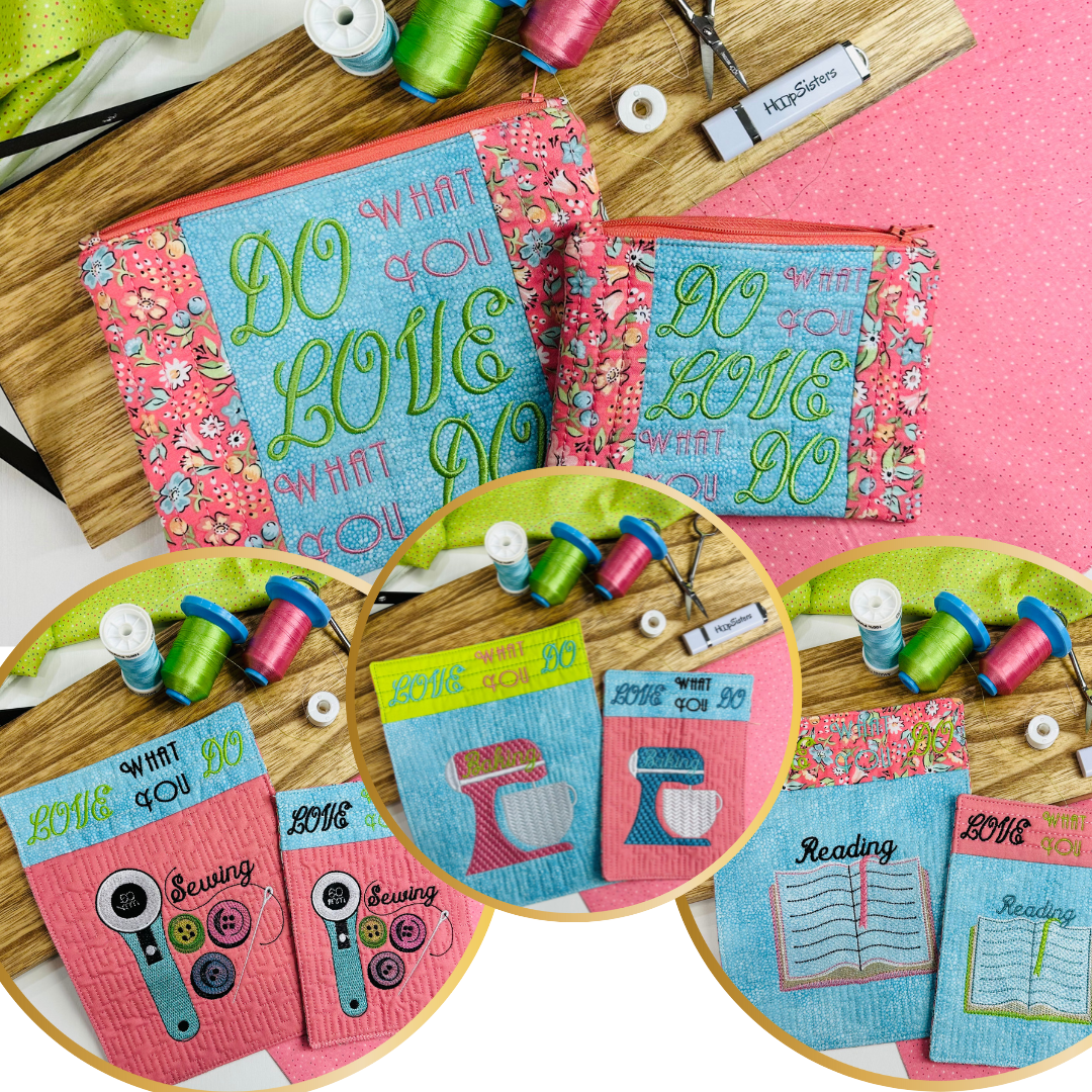 “Do What You Love” Zipper Pouches in two sizes, plus Mug Rugs in two sizes, featuring four embroideries: Reading, Baking, Gardening, and Sewing.
