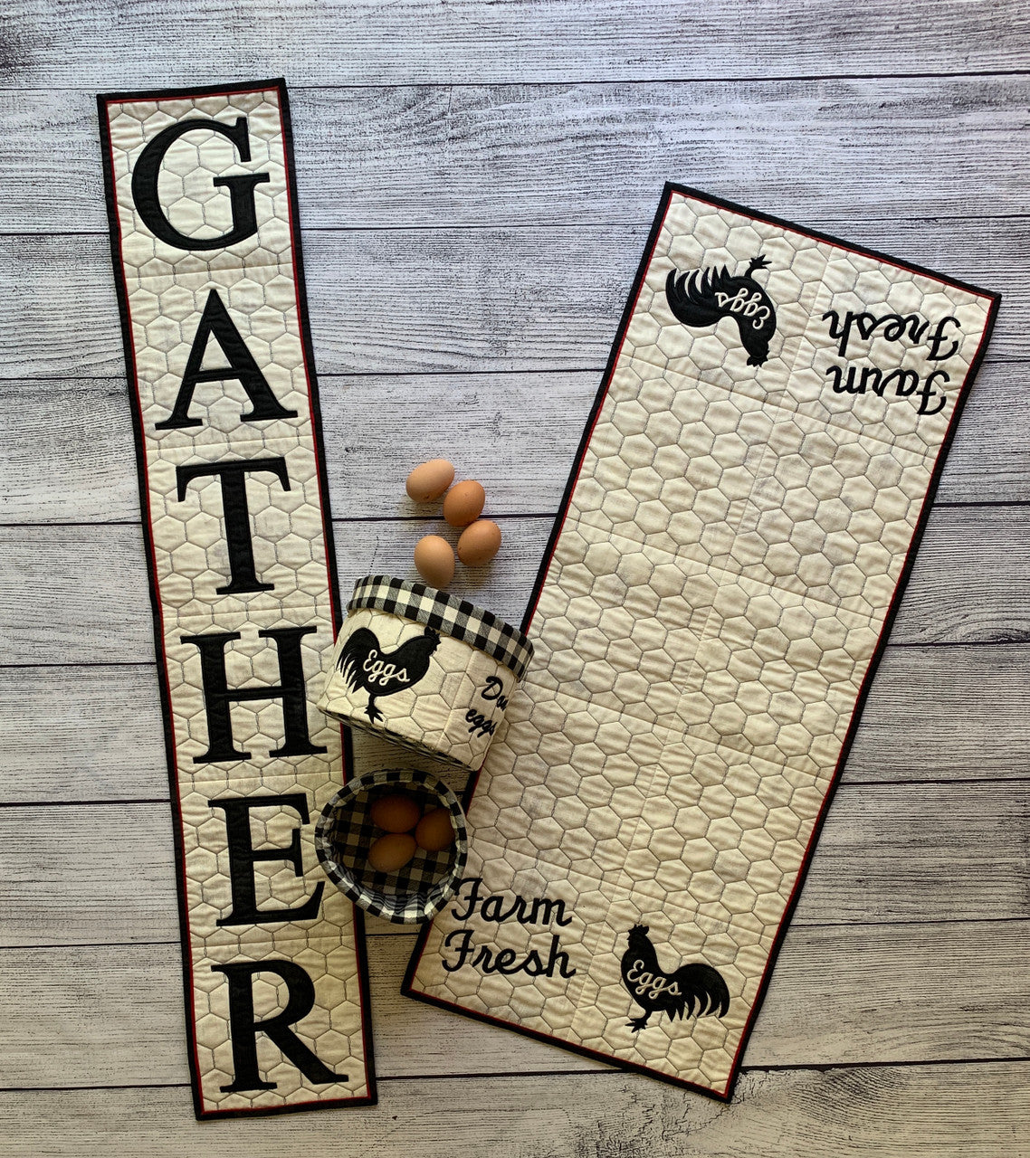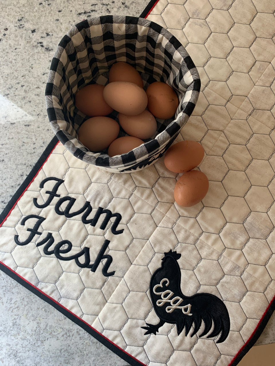 From the egg basket to the Farm Fresh table runner and Gather Wall-hanging, check out the chicken wire quilting!