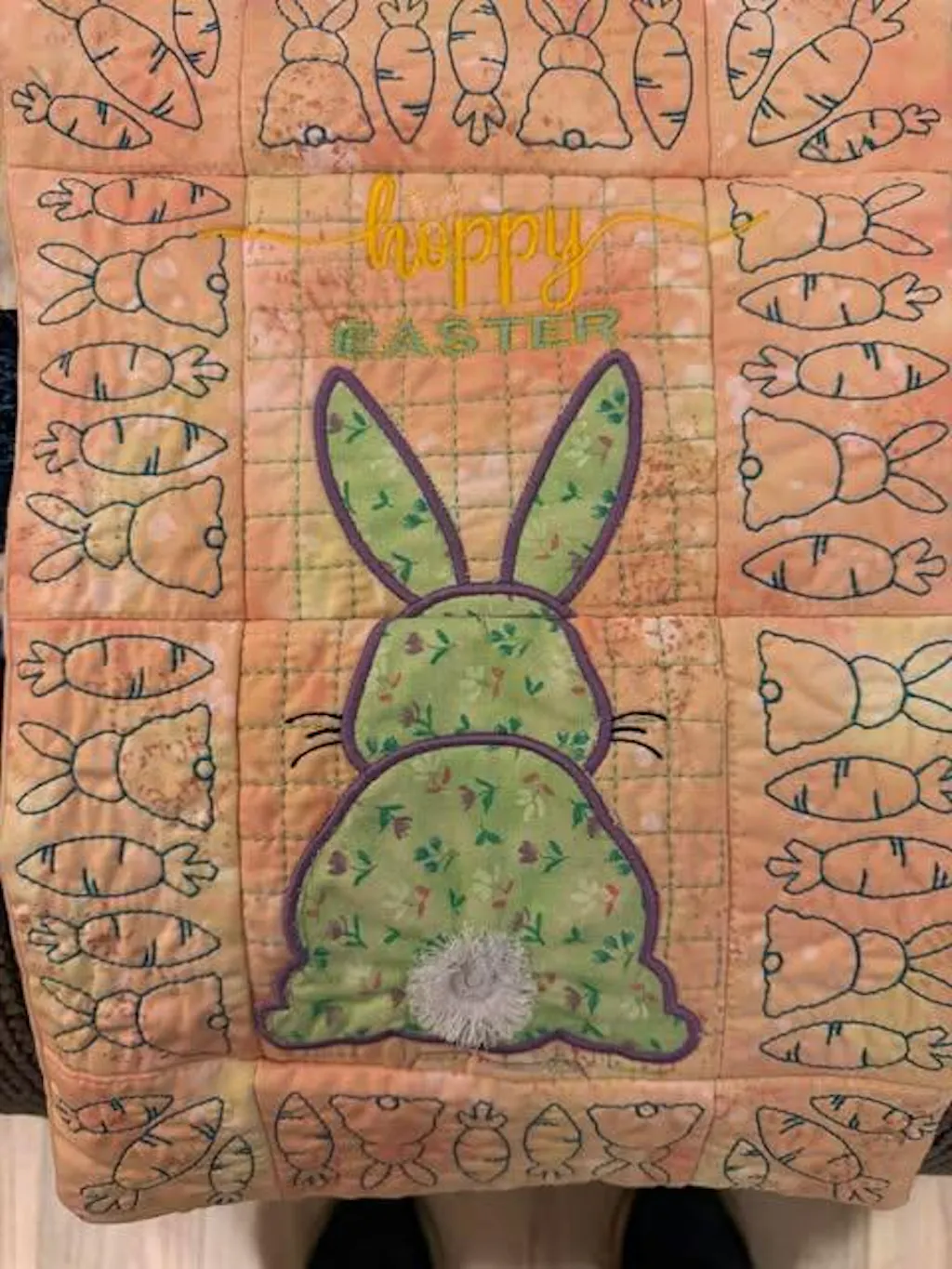 Hop into Easter with this quick 2 block wall hanging or mini mat! This design features an applique bunny with a fringe tail, all made right in the hoop of your embroidery machine. Beautiful "Hoppy Easter" lettering and the quilted border finish off this oh-so-cute Easter design.