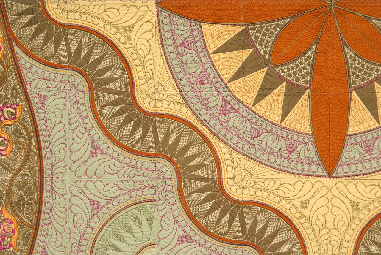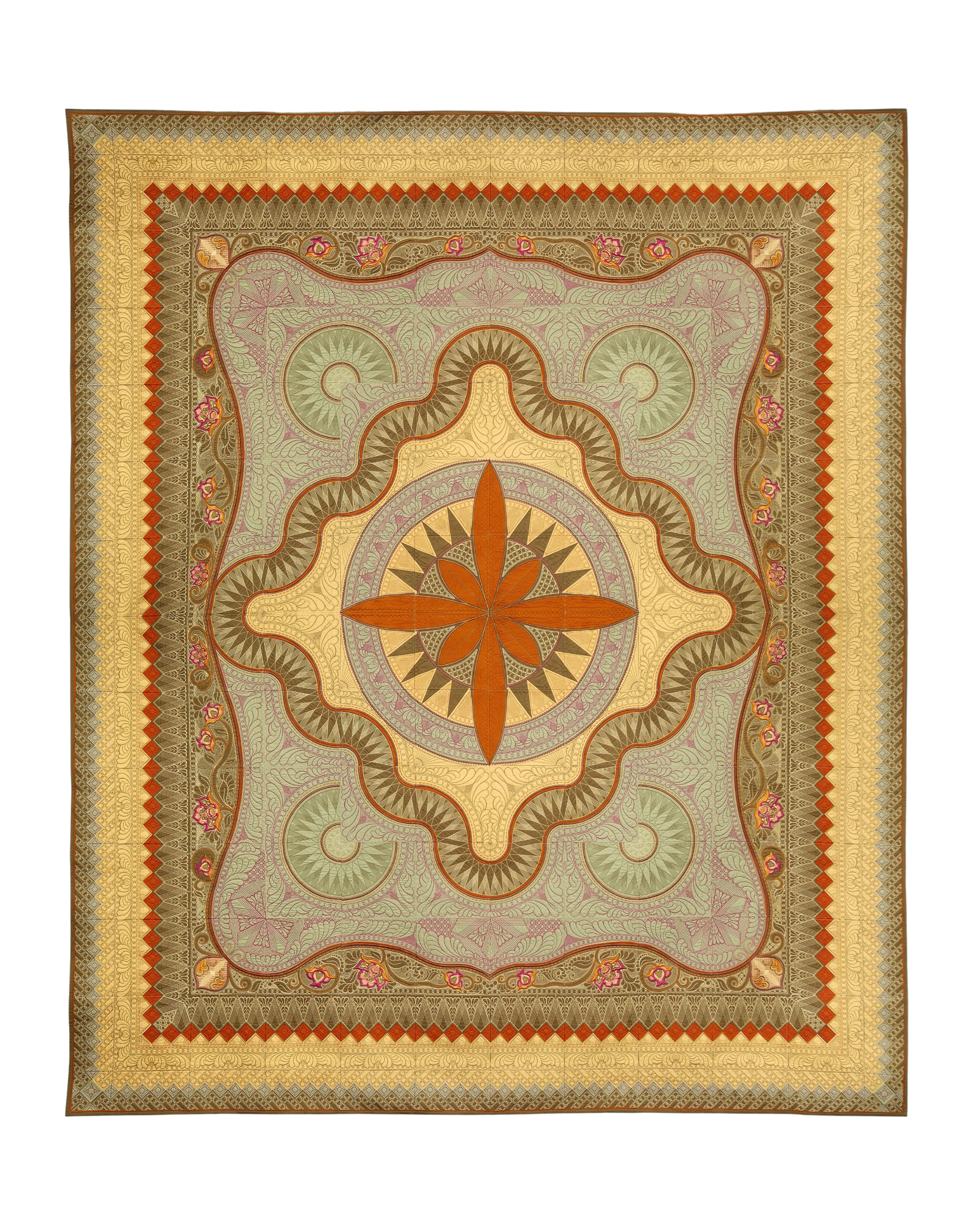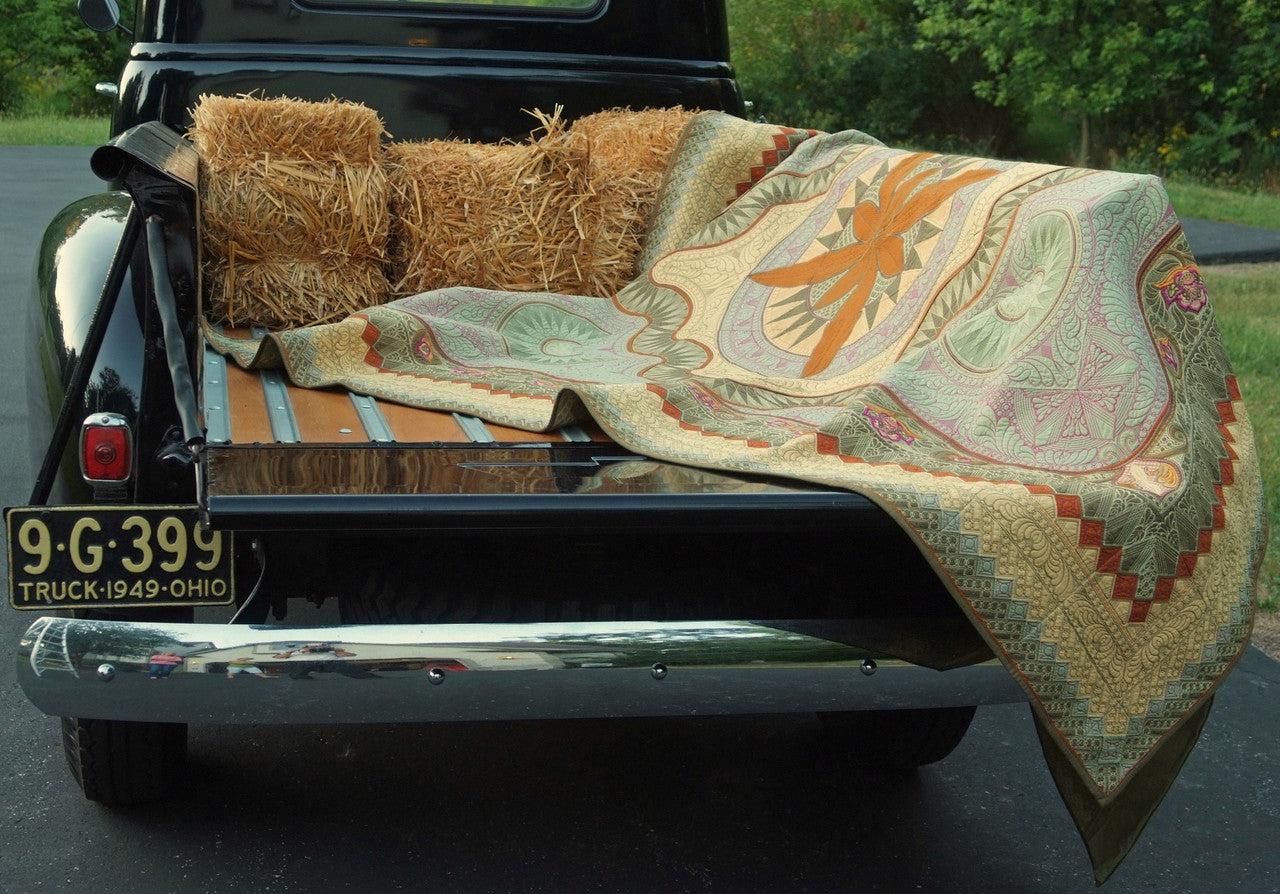 This beautiful HoopSisters design features a center medallion surrounded by undulating curves and bordered by a curvy applique border. Decorative flange echos the curves while stunning Sharon Schamber quilting highlights the quilt making this a family heirloom to cherish. An additional double French braid border is included with this heirloom quilt.