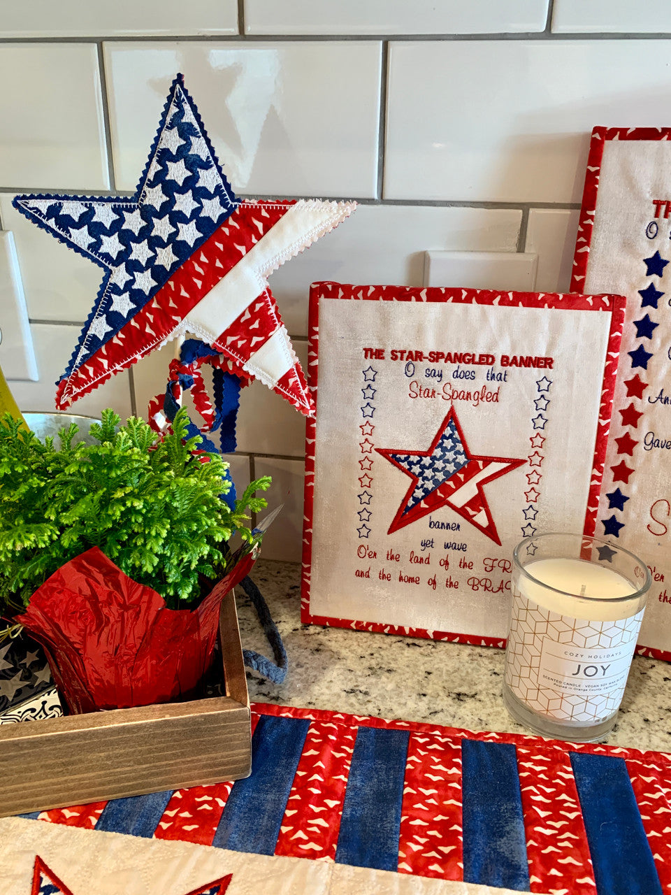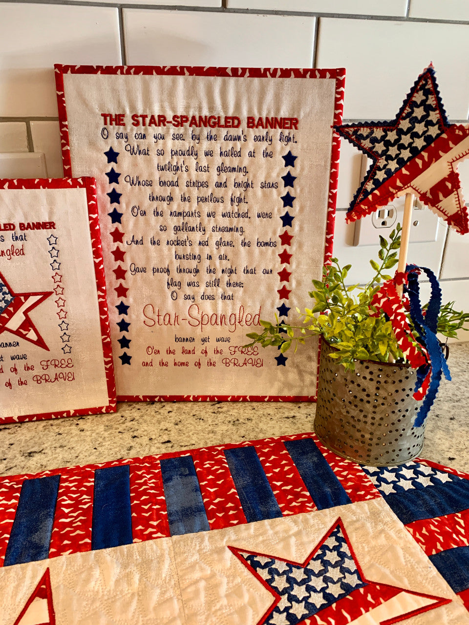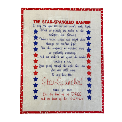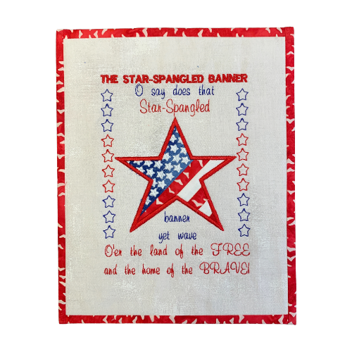 The Star Spangled Banner completes this trio. Embroider America’s National Anthem and stretch it onto a canvas to complete your Patriotic theme!