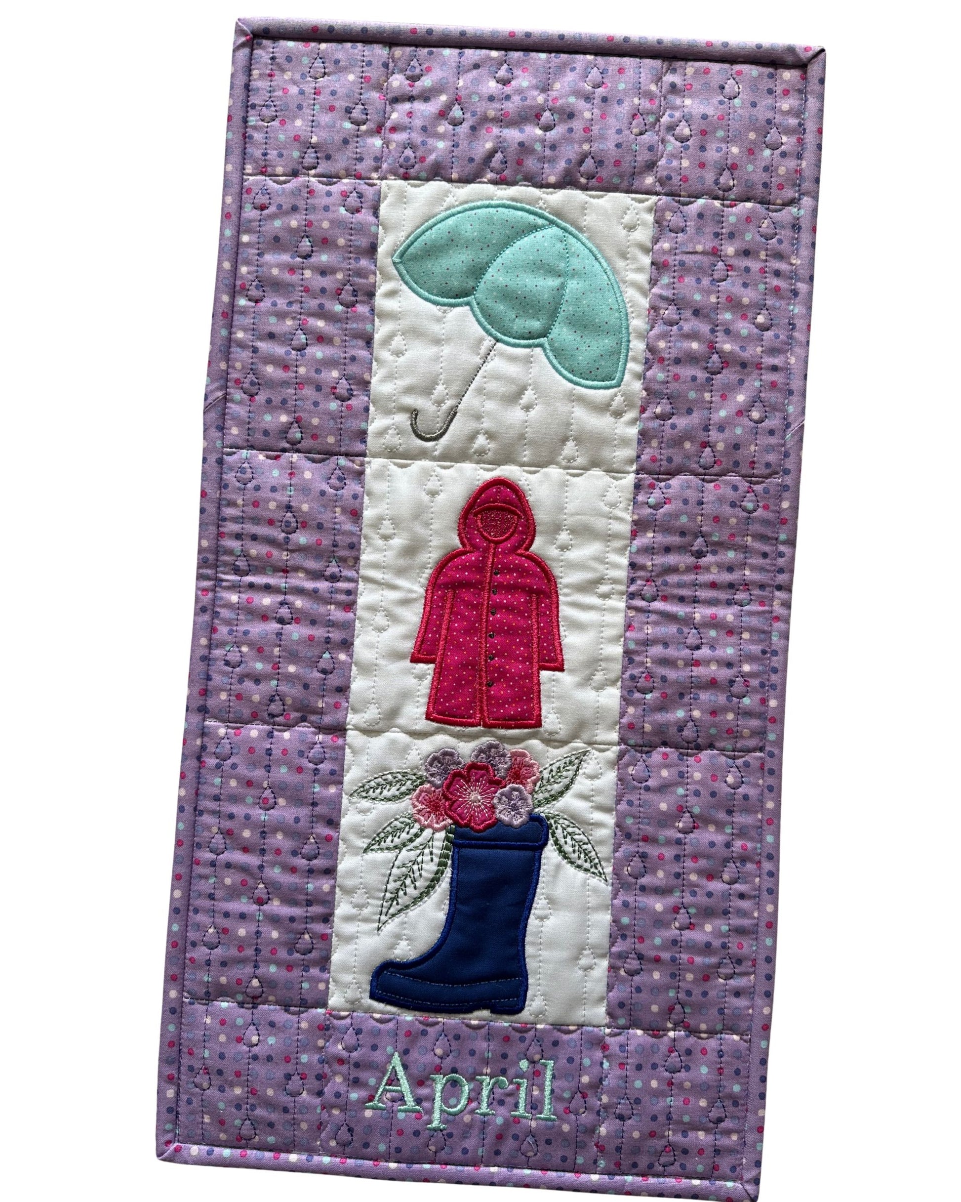 A rainy day doesn't get much cuter than the Rain Showers Wall Hanging! A simple border of quilted raindrops surrounds everything you need for a rainy day. The applique umbrella and raincoat are both simple and eye-catching in this design. The rainboot overflowing with beautiful flowers rounds out the applique in this Rain Showers Wall Hanging.