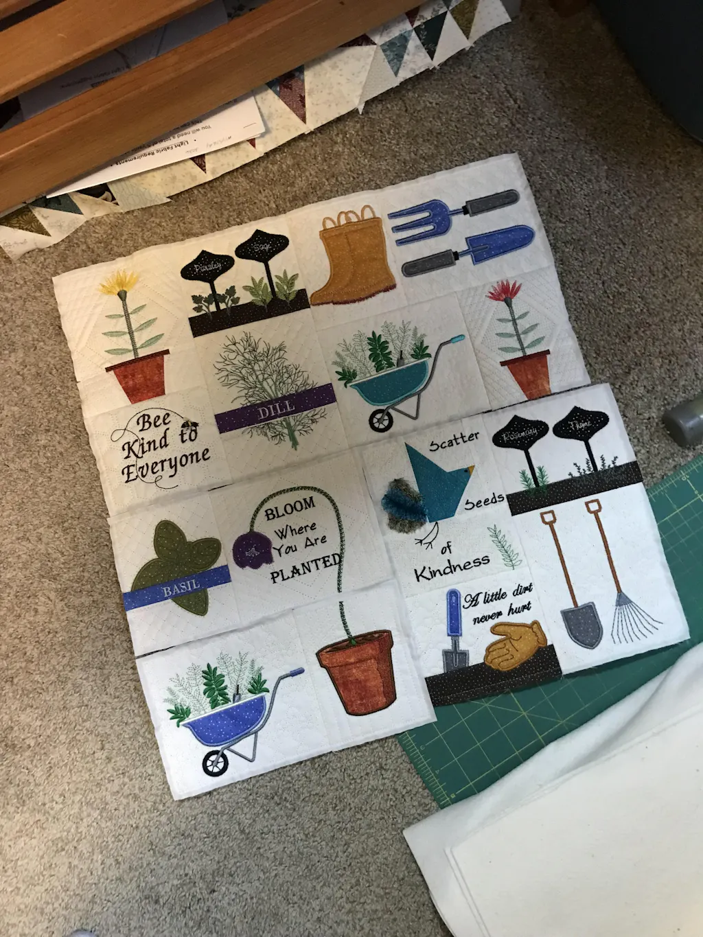 Seed Thyme, this fun garden-themed quilt is colorful and a joy to stitch. There are four sections and a gorgeous border. The tools, seed packets, dirt, gloves, and even a bird are ready to help with your planting. Every block has a different style of quilting that is part of the design.