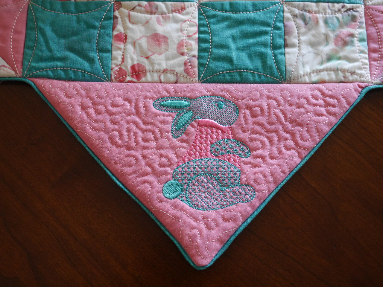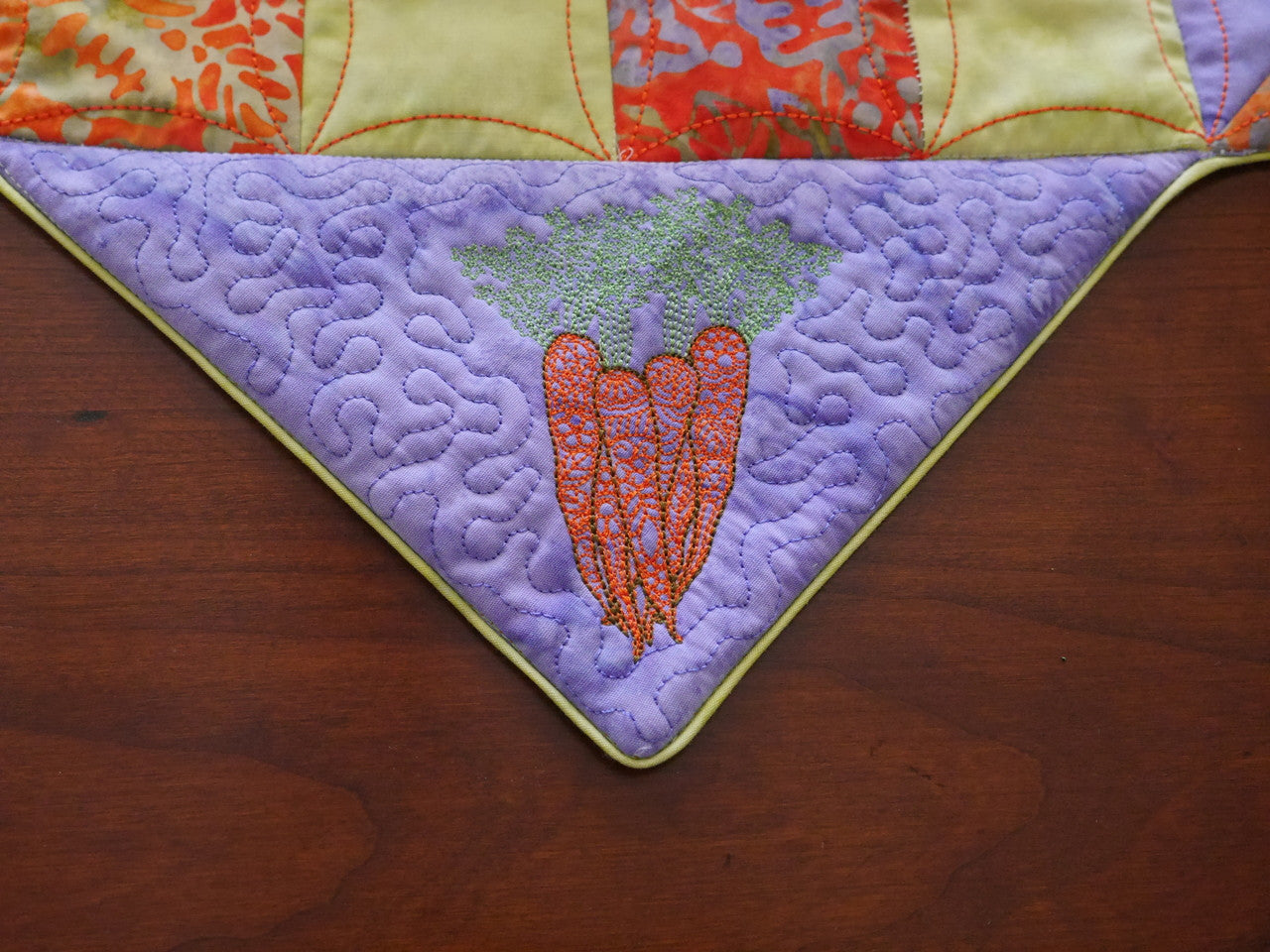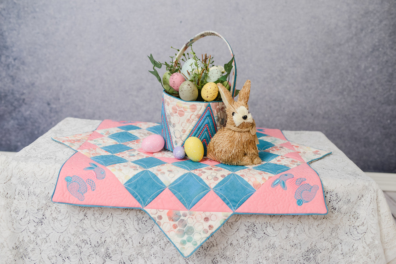 Our Spring Table Topper comes with a choice of either a Bunny corner, or a Carrot corner! Simple pre-stitched strips make easy patchwork blocks in the hoop. Add the corner of your choice and you have a great little topper for your spring table!
