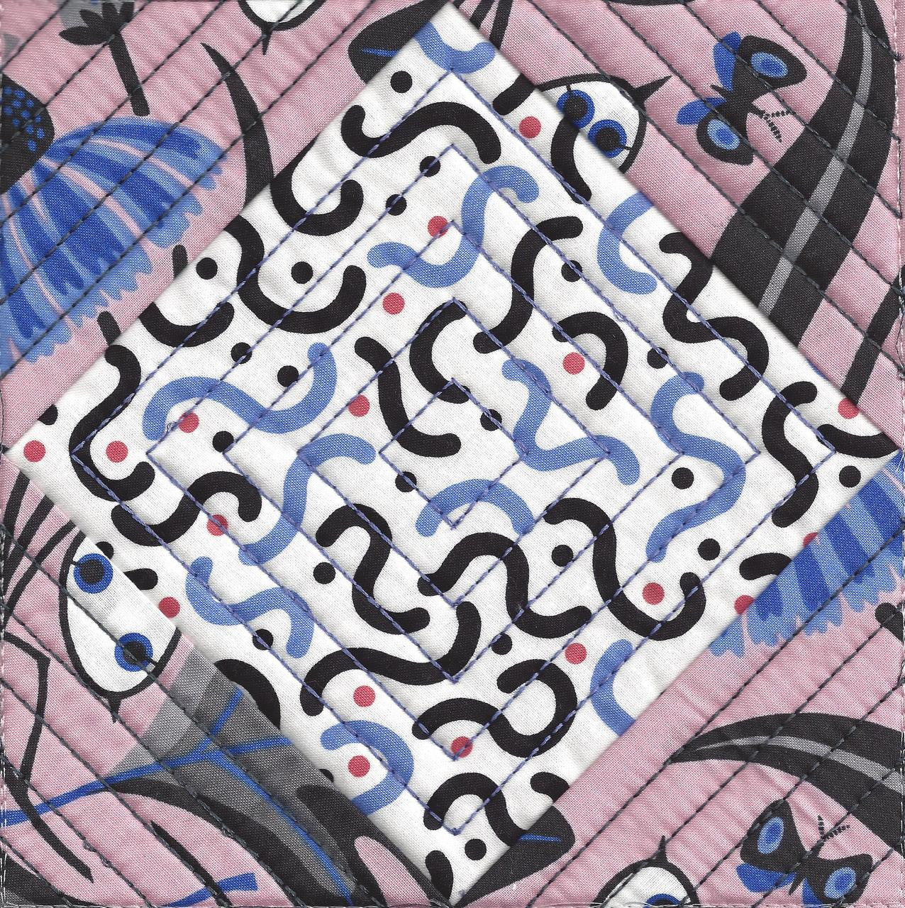 Square in a Square One works like this: First, build your quilt block front which includes a beautiful stipple in the center on point square. Next, add your embroidery to the center of the stippled quilt block. Choose any appropriately sized embroidery you'd like. Applique, redwork, whatever! Lastly, add the back and final quilting from our Square in a Square One design!