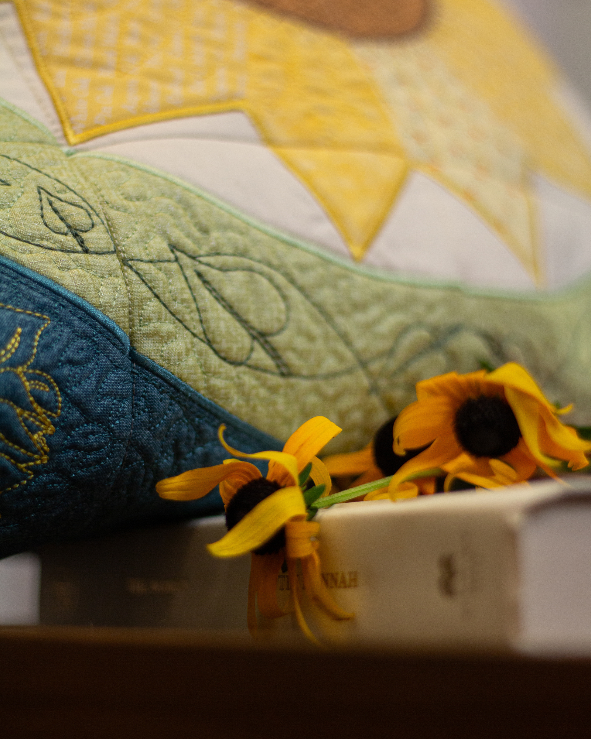 Your late summer and fall table never looked so good. The versatile Sunflower Table Topper comes in 5" and 7" block sizes PLUS a single or triple layout AND round or squared off shapes. Meandering vines and leaves embellish the circular area giving it a nice finish to the rounded layout. The square layout has all that, PLUS a beautiful, embroidered sunflower in the corners. The center of the sunflower is the perfect place to set your favorite vase or centerpiece. Quick to stitch. Great for gifting.
